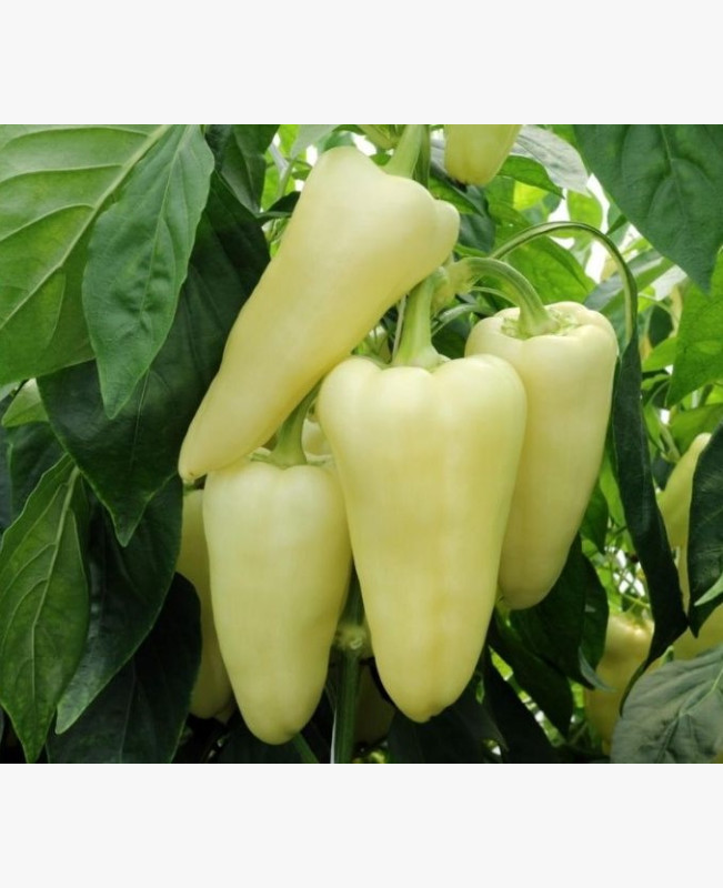 A fast-growing, prolific determinate variety, 25-30 cm tall. Its special feature is its dark green foliage, very good resistance. Not sensitive to lack of light. Fruits are fillable, white, sweet, shouldered, tapering conical, drooping, weighing 80-90 g. Xanthomonas-tolerant. Recommended for propagation, field cultivation, sowing in situ. Resistant to common strains of tobacco mosaic virus. Suitable for fresh consumption.